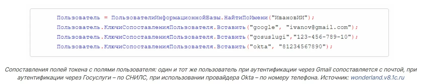 Например, пользователь может пройти аутентификацию в Gmail по почте, в Госуслугах с использованием СНИЛС, а у своего интернет-провайдера по номеру телефона. Для таких случаев, у объекта встроенного языка 1С ПользовательИнформационнойБазы появится свойство КлючиСопоставленияПользователя, как раз для его сопоставления с полями (свойствами) JWT-токена: