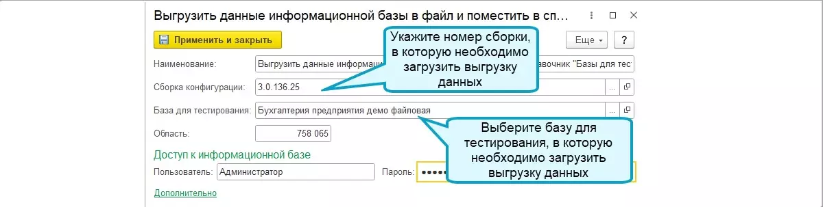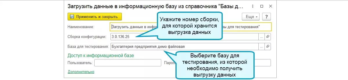 Из справочника «Базы для тестирования» также можно загружать данные в область. При настройке шага выгрузки необходимо указать версию программы и номер области. Версия, из которой выгружены данные, и версия, в которую загружаются данные, должны совпадать.