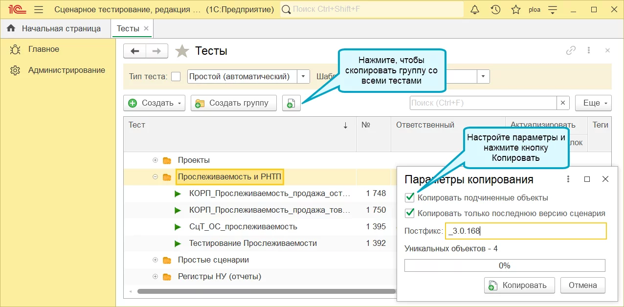 Теперь можно копировать целые группы тестов, включая вложенные задания — это облегчает создание повторяющихся сценариев и экономит время при работе с типовыми структурами.