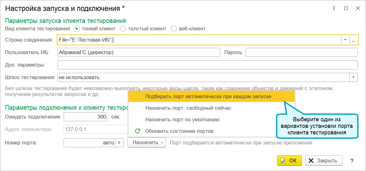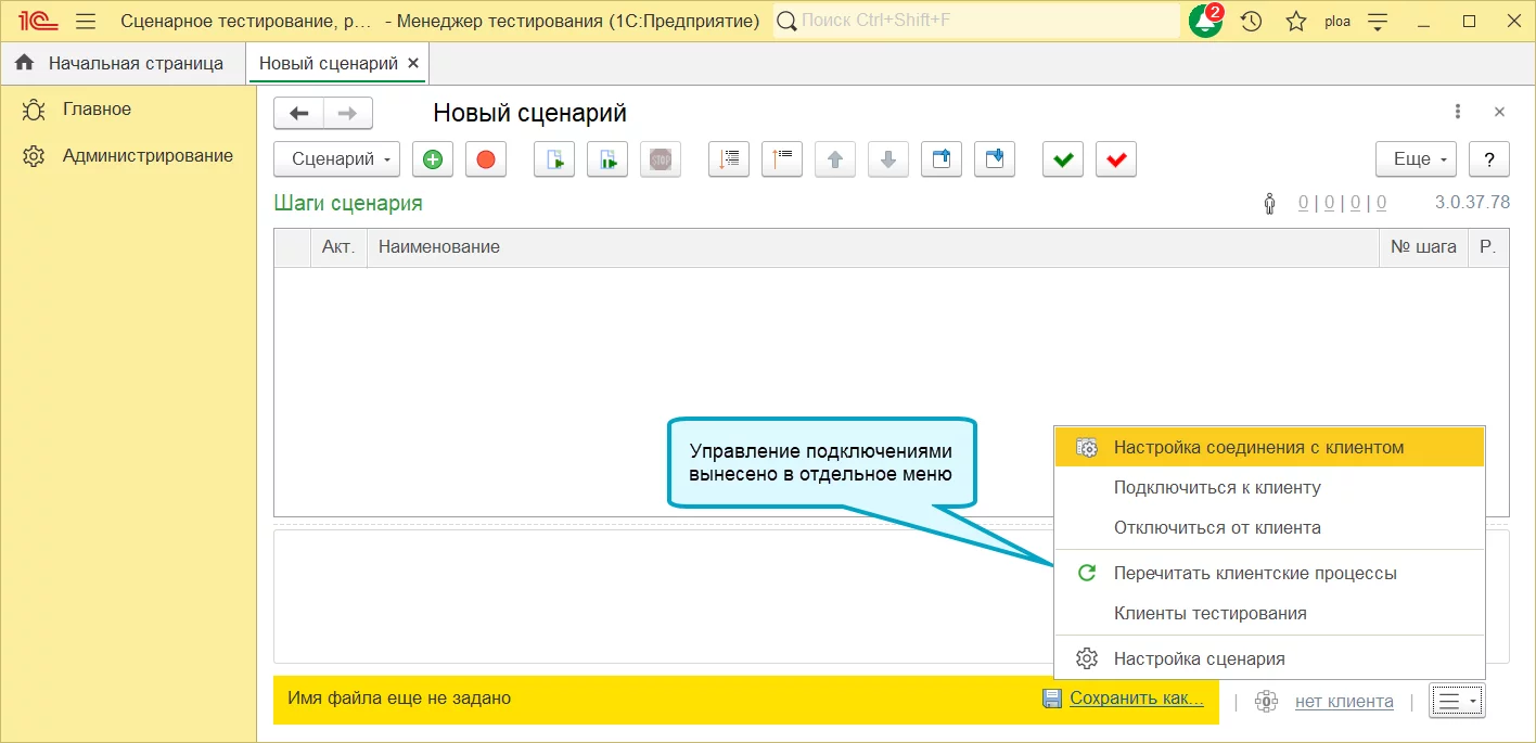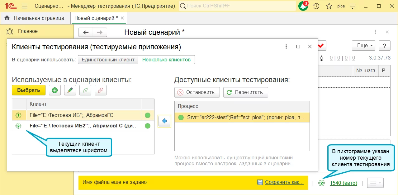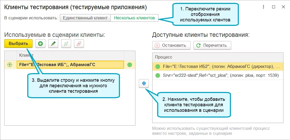 Менеджер тестирования теперь может хранить информацию о нескольких подключениях. Для переключения между клиентами используется форма Клиенты тестирования. Это особенно полезно при отладке и выполнении одного сценария на разных клиентах, а также для сценариев обмена данными между информационными базами.