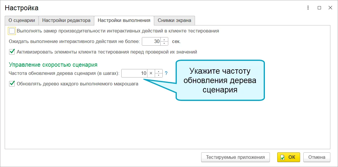 Теперь в настройках сценария можно управлять частотой обновления дерева сценария на форме.