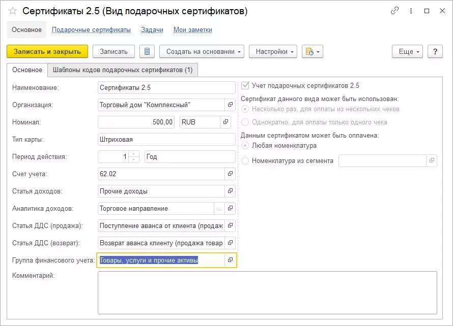 Новый вариант включается в настройках подарочных сертификатах. На текущей момент в 1С можно будет использовать одновременно как сертификаты старого образца, так и нового.