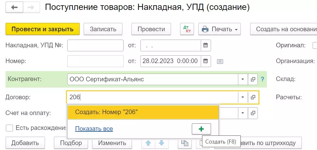 В поле Договор вручную укажите номер договора, который желаете создать. И нажмите знак плюс (Создать).
