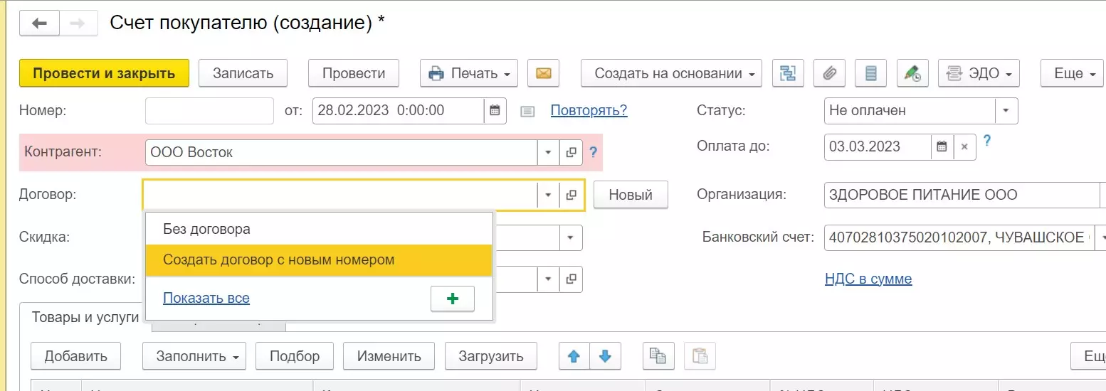 - Включите отметку об отправке в электронном виде в шапке документа напротив поля Договор.
