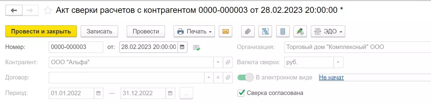 При поступлении Акта сверки без расхождений отметка Сверка согласована устанавливается автоматически. Документ становится недоступным для редактирования.