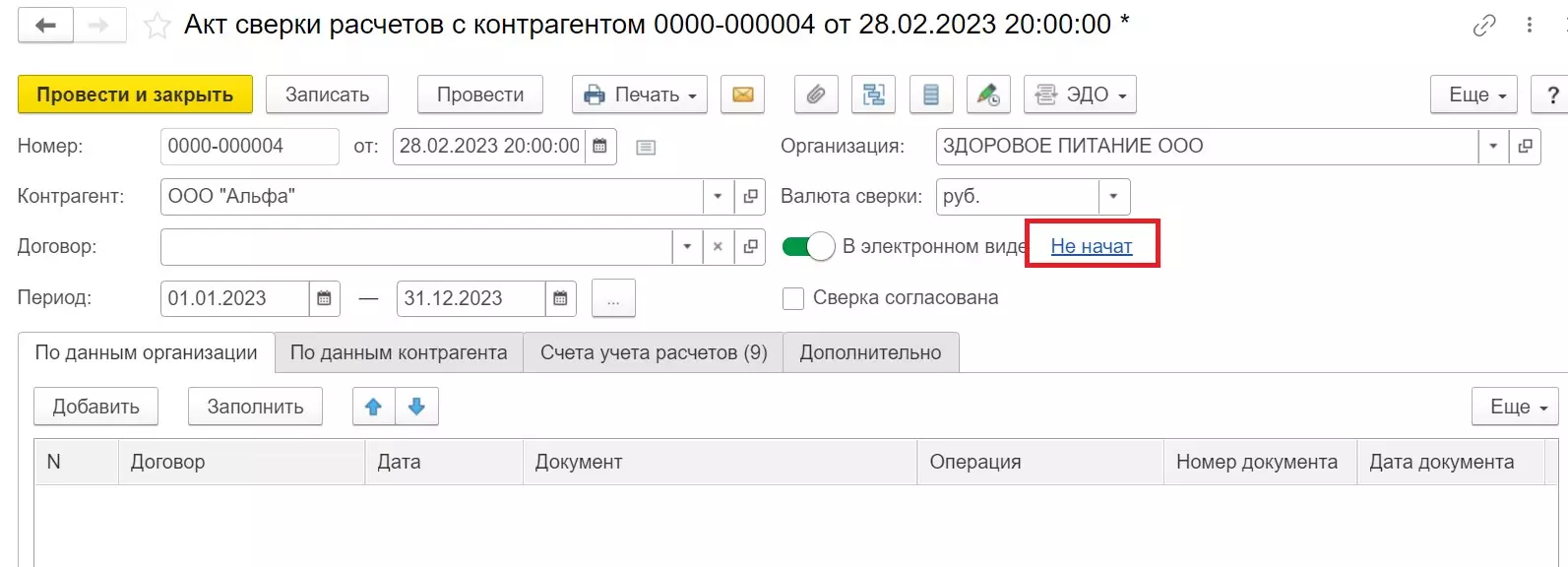 - Перейдите по ссылке Не начат (на рисунке ниже выделено красным) для подписания и отправки акта по ЭДО.