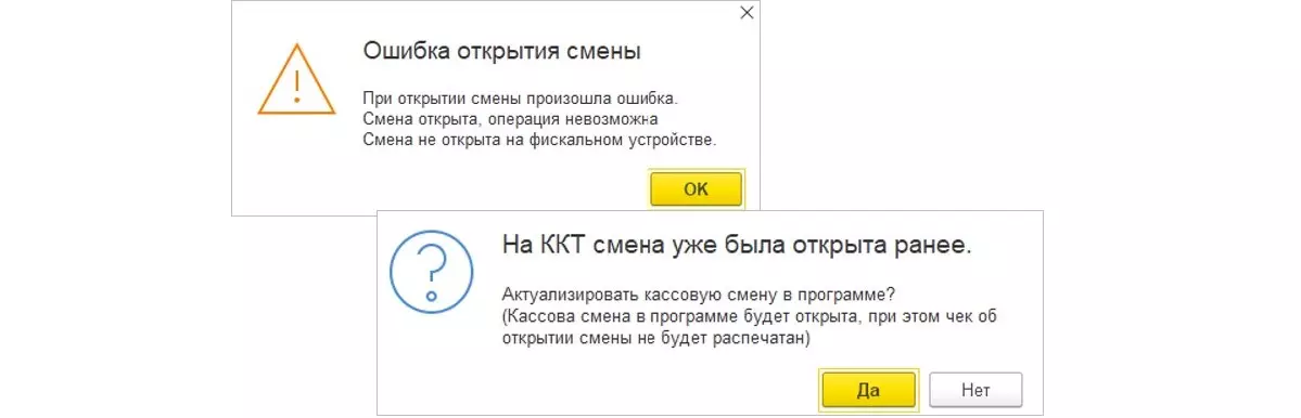 Также теперь проверяется актуализация смены. Если в 1С открыта смена, а на ККТ закрыта или наоборот, 1С предложит актуализировать смену. В случае рассинхронизации предложит решить данную проблему. После чего 1С или закроет смену в базе, или же откроет. В последнем случае на ККТ смена повторно открыта не будет.
