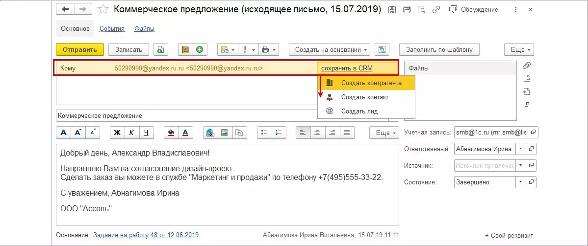 Был улучшен почтовый клиент. В текущей версии Розницы 3.0.2 разработчики сделали сопоставление адресатов и контактов в базе 1С.