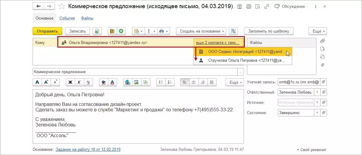 В случае, если e-mail будет дублироваться в нескольких контактах в базе, 1С отобразит это и подскажет верный.