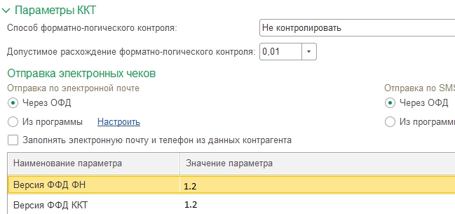 Чтобы проверить версию ККТ и фискального накопителя, необходимо перейти в раздел «Администрирование», в меню «Настройки программы» выбрать «Подключаемое оборудование». В поле «Тип оборудования» указать «ККТ с передачей данных» и установить галку «Все рабочие места». В списке появится используемое оборудование, которое необходимо открыть. В параметрах ККТ будет указана версия ФФД ФН и версия ФФД ККТ.