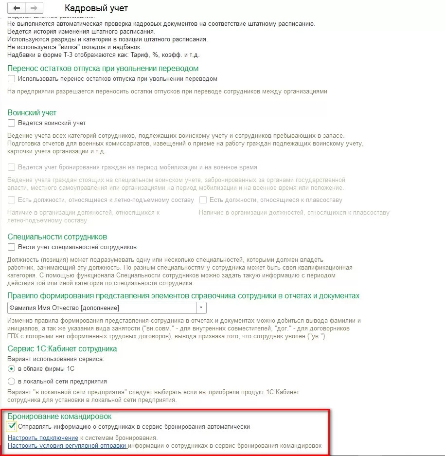 - Реализована интеграция с сервисом Smartway - сервис планирования деловых поездок, с помощью которого можно бронировать отели и покупать билеты, не прибегая к услугам агентства (ранее была реализована только в версии КОРП). Интеграция настраивается в части регулярной выгрузки сведений о сотрудниках (за исключением возможности отбора по подразделениям). В настройки кадрового учета добавлен раздел «Бронирование командировок».