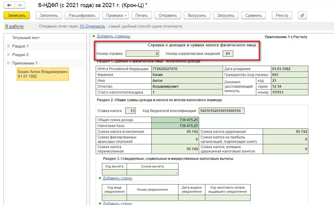 - если ошибочно сдали справку по ФЛ, а у него доходов не было (сторнировали или совсем удалили доходы физического лица), то в Приложении 1 отчета 6-НДФЛ «Справка о доходах и суммах налога физического лица» заполняется с присвоенным ранее (в первоначальном отчете) номером и номером корректировки = 99 (особый признак, отменяющий сведения);