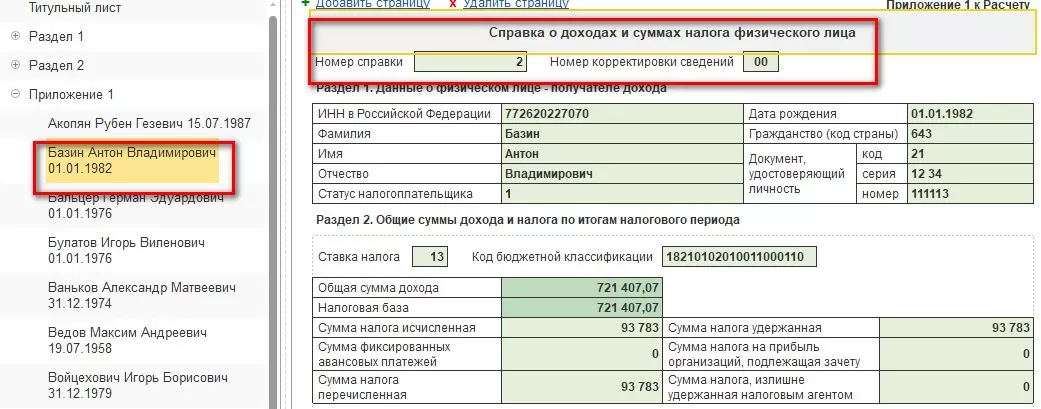 Реализовано автоматическое заполнение Приложения 1 корректирующими справками о доходах и суммах налога физического лица. В системе анализируется более исходный документ 6-НДФЛ, переданный в ИФНС, и что изменилось в базе по сравнению с теми переданными сведениями.