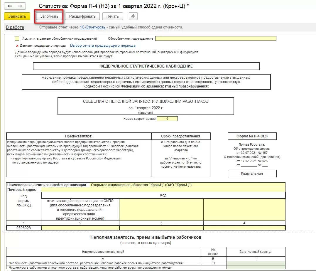 Также реализовано автоматическое заполнение новой формы П-4(НЗ) с 2022 года, ежеквартальный отчет для организаций, в котором работодатели сообщают о сотрудниках на условиях неполной занятости, их численности, поступлении и выбытии за последние три месяца, в соответствии с приказом Росстата от 17.12.2021 года № 925. Форма предоставляется в обязательном порядке всеми организациями (кроме малых), средняя численность которых превышает 15 человек.