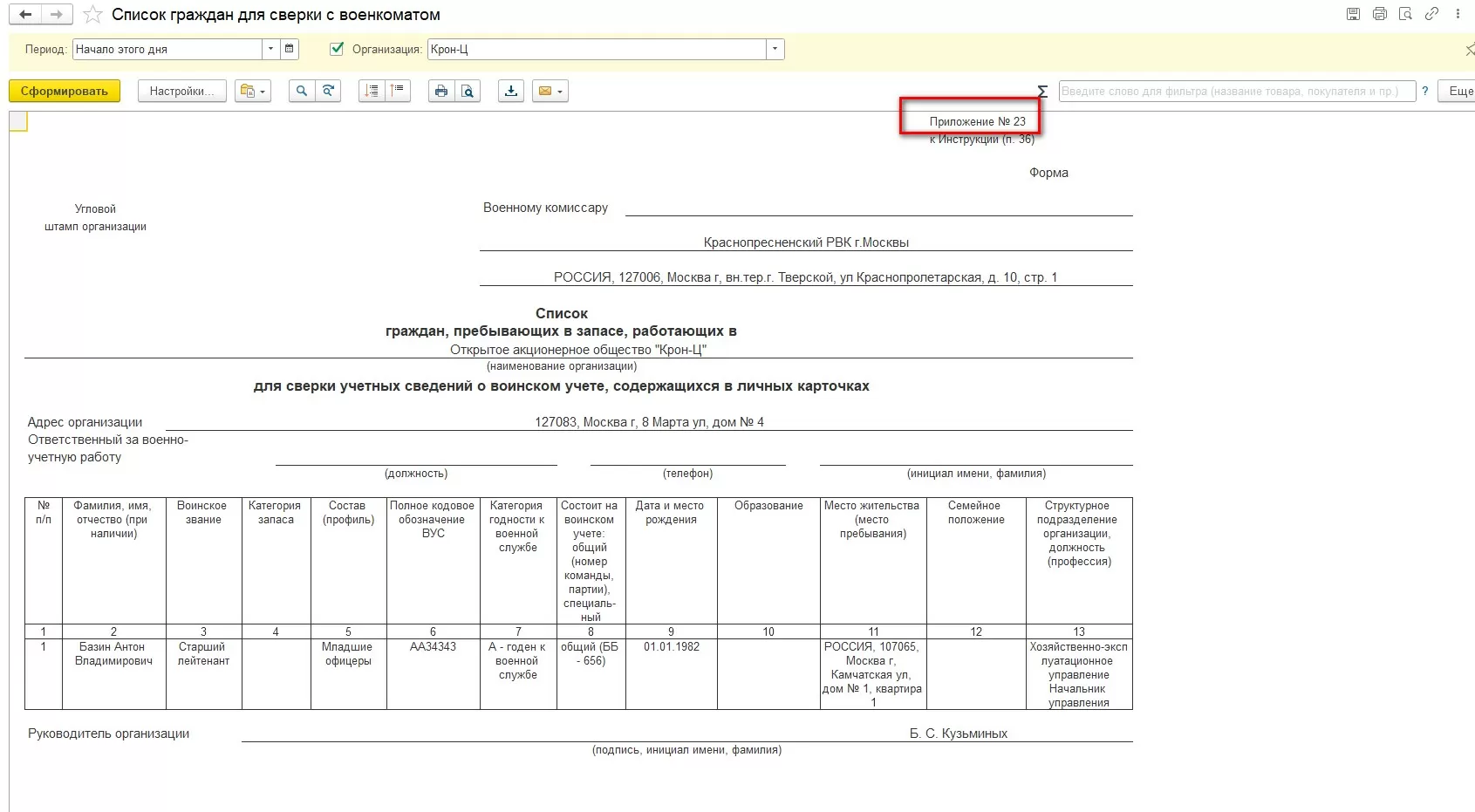 - обновили отчет «Список граждан для сверки с военкоматом», с 08.01.22 (Приложение № 23). В шапке отчета выводится информация о том, что это приложение к приказу: