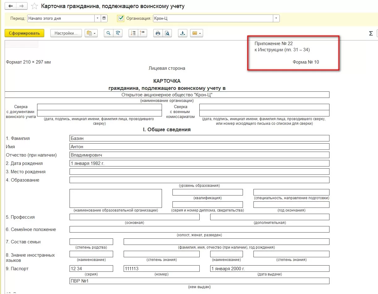 - добавлен новый отчет «Карточка гражданина, подлежащего воинскому учету» (Приложение № 22). Это новый документ группы кадровых отчетов в отчетности для военкоматов. Заполняется автоматически для тех, у кого заполнены сведения о воинском учете: