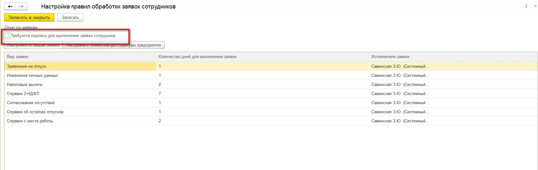- В сервисе «1С:Кабинет сотрудника» добавлена возможность отключить необходимость подписания электронной подписью для выполнения заявок сотрудников. Например, если пришла заявка от сотрудника и для того, чтобы выполнить эту заявку, ее надо было подписать электронной подписью ответственного лица. И так как это не всегда может быть нужно, то для этого в форму настройки правил обработки заявок сотрудников добавлен флажок «Требуется подпись для выполнения заявки сотрудника»: