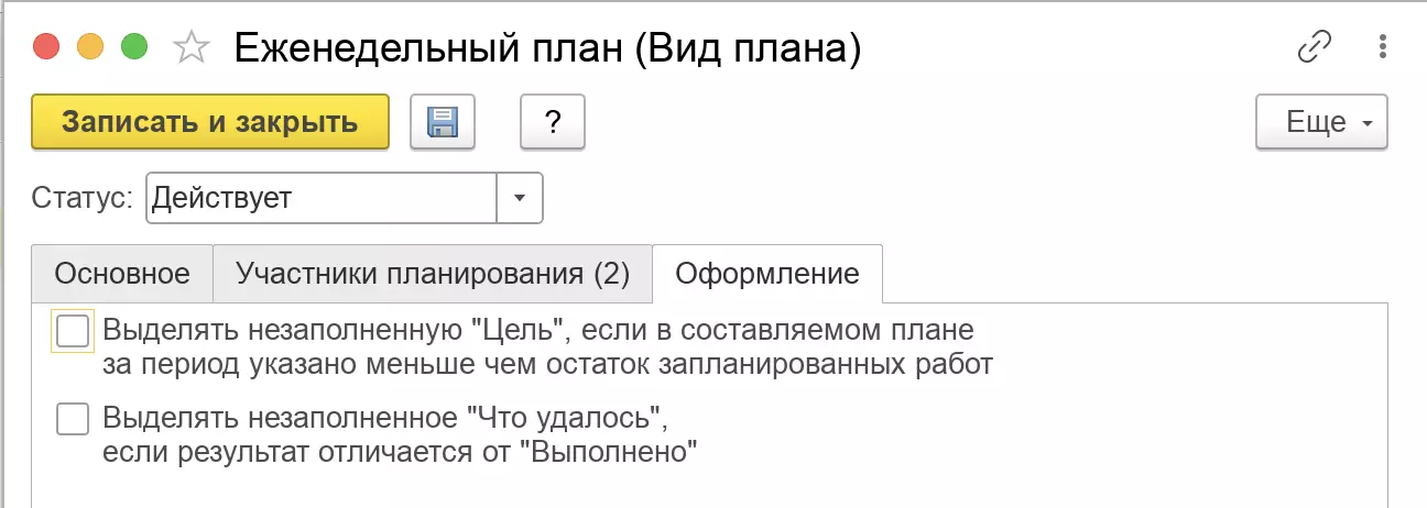 В карточке вида плана появилась возможность настраивать условное оформление для колонок Цель и Что удалось. Настройка осуществляется на новой закладке Оформление.