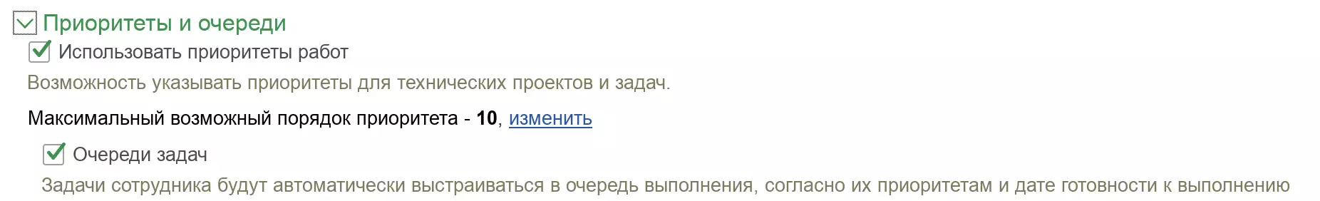 Реализована новая подсистема, которая позволяет указывать приоритеты для технических проектов и задач. Для ее использования необходимо установить соответствующий флажок в Общих настройках. После включения механизма можно указать максимально возможный порядок приоритета.