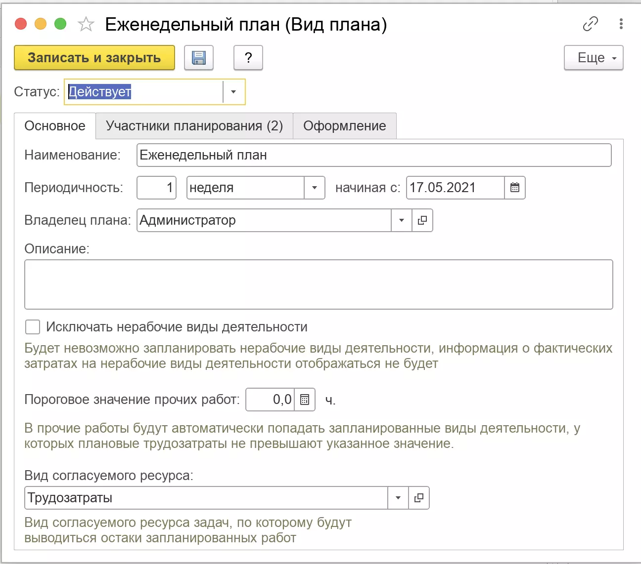 В карточке Вида плана появился флажок, позволяющий запретить планирование нерабочих видов деятельности. Нерабочими считаются те виды деятельности, у которых в качестве вида времени указано Нерабочее.