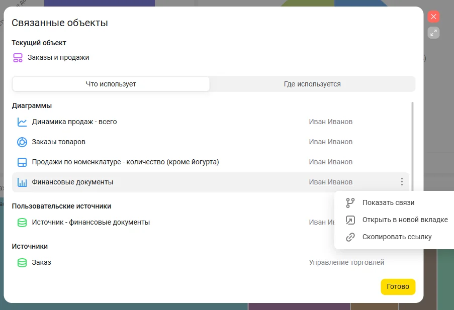Это позволяет быстро оценить масштаб изменений. Например, перед редактированием источника данных можно сразу увидеть, на каких диаграммах и дашбордах это отразится, и заранее оценить возможные последствия.