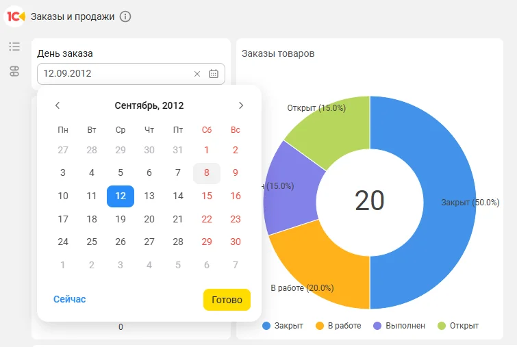 Реализован новый, более гибкий элемент управления для отбора данных по датам. В отличие от прежнего выпадающего списка, теперь доступен календарь для выбора даты и возможность задавать открытые диапазоны. Элемент можно создать через конструктор или быстро по клику на поле, с гибкой настройкой наименования и значения по умолчанию.