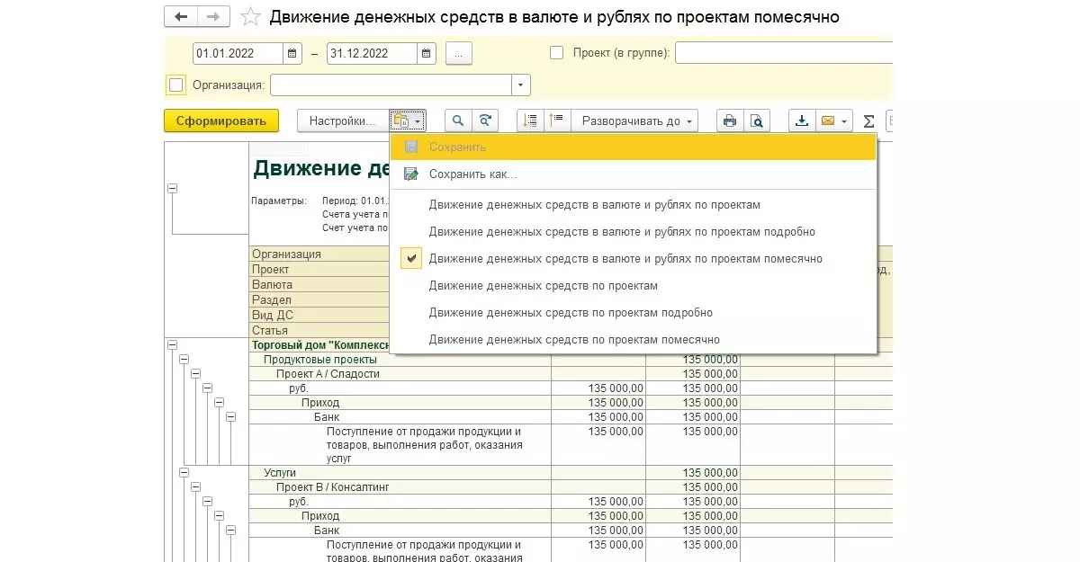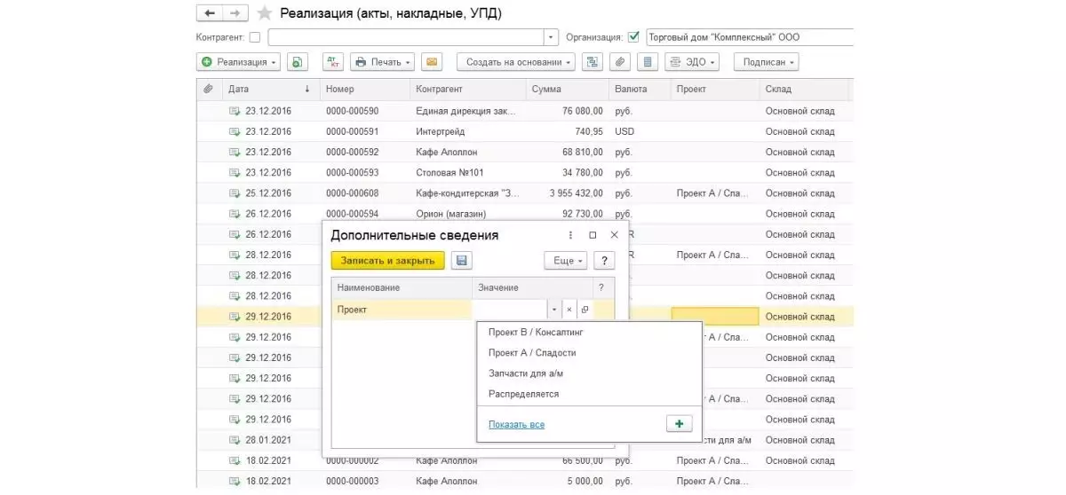 Теперь можно устанавливать связь к документам проектов и наблюдать в отчетах по ДДС, расходах, реализациях, прибыль или убыток. Для этого из документа или через реестр документов надо открыть дополнительные сведения и указать проект.