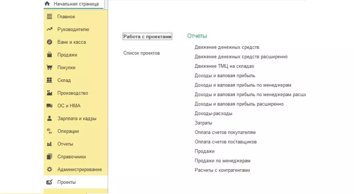 Данное расширение отображается как отдельная подсистема в информационной базе (ИБ) со списком проектов, работы с ними и отчетами.
