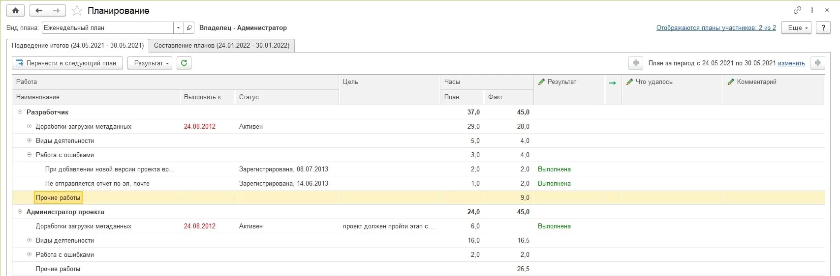 Рабочее место «Планирование» группирует задачи по типу. И выполняет план-фактный анализ по каждой группе, что позволяет быстрее ориентироваться в планах на крупных проектах.