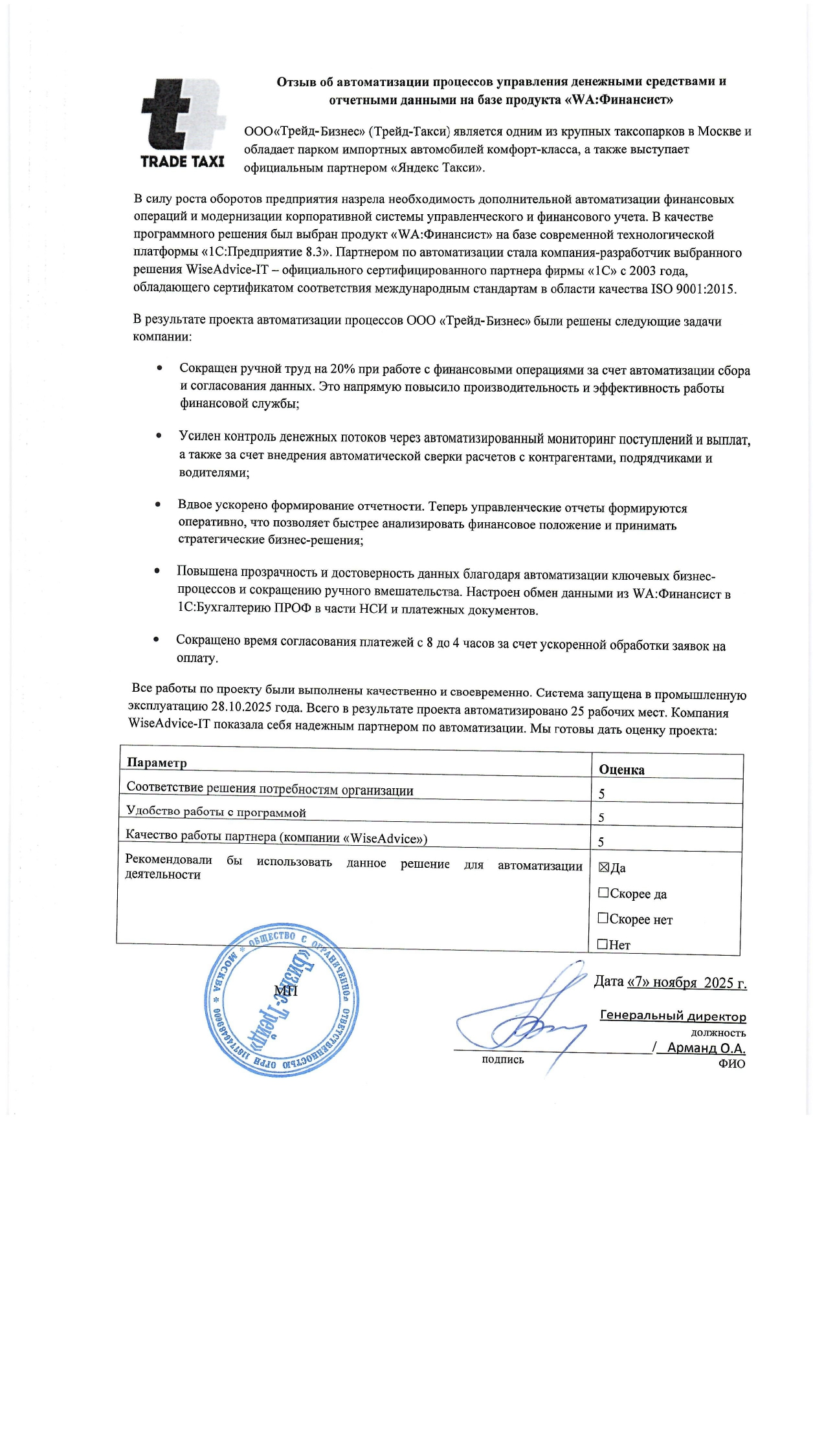 Автоматизации финансового учета для крупного таксопарка «Трейд-Такси», ключевого партнера экосистемы «Яндекс Такси»