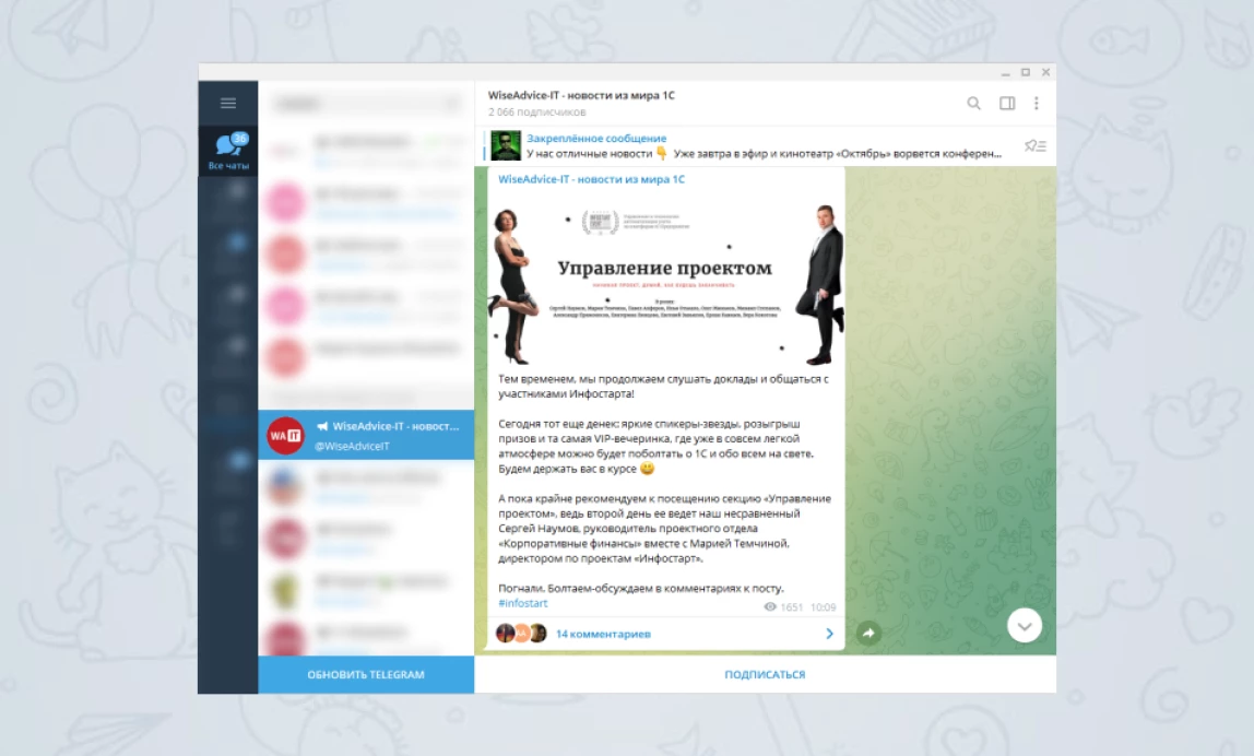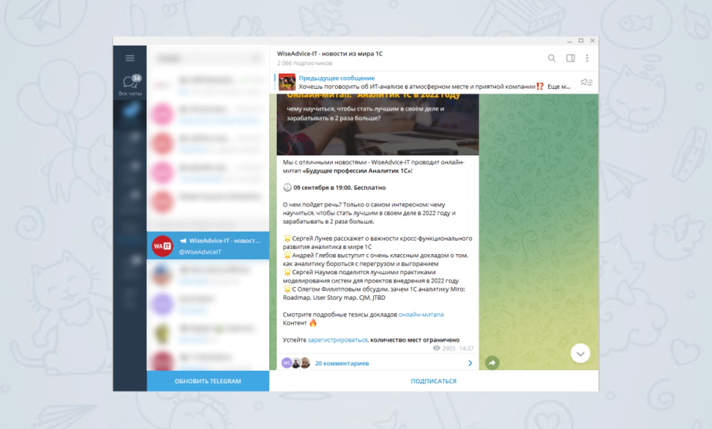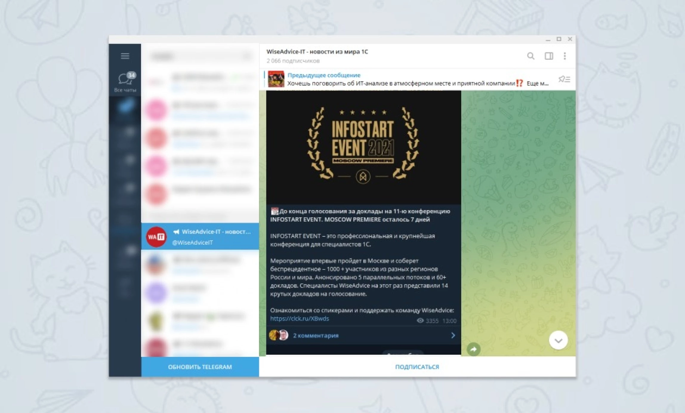 Больше не нужно просматривать десятки сайтов по тематике 1С, чтобы быть в курсе всех нововведений. Наши эксперты делают это за вас. Они отбирают, анализируют и оставляют только самое важное, при этом сопровождая новости своими комментариями. На канале мы также публикуем анонсы значимых мероприятий и розыгрыши для подписчиков (например, онлайн-билетов на конференцию Infostart).
