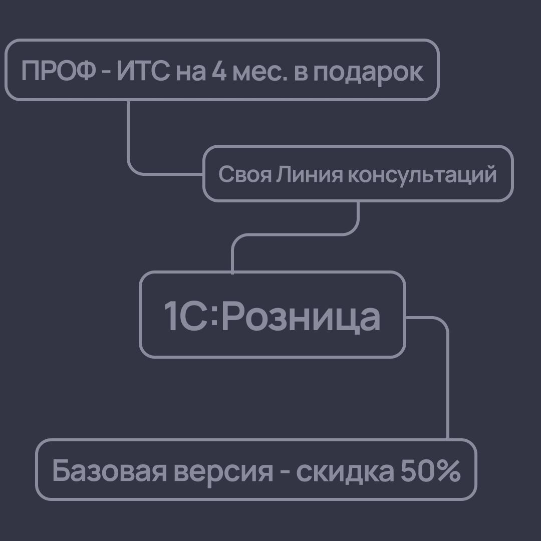 Приобретая у нас, как у официального партнера 1С, программу Розница версии ПРОФ и сразу оформляя на 1 год договор сопровождения ИТС (КП) того же уровня, вы получите бесплатный пакет услуг: