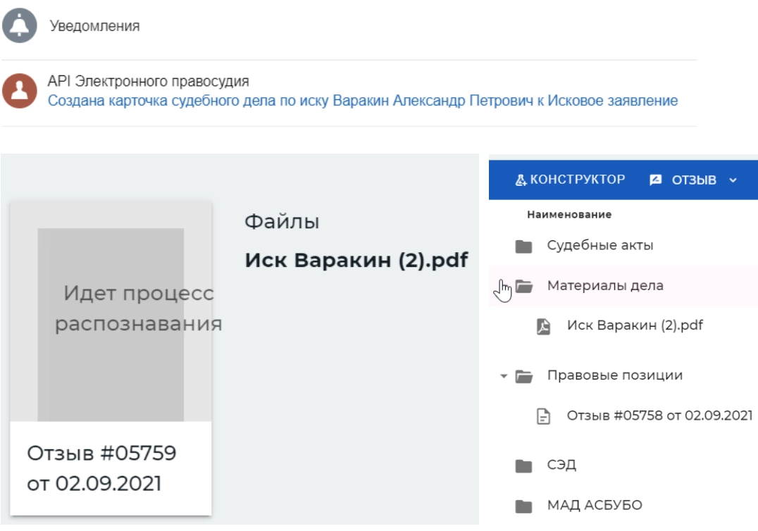 - Произведет поиск по номеру дела. Если найдет – прикрепит к нему иск, нет – создаст новое дело и уведомит ответственного
